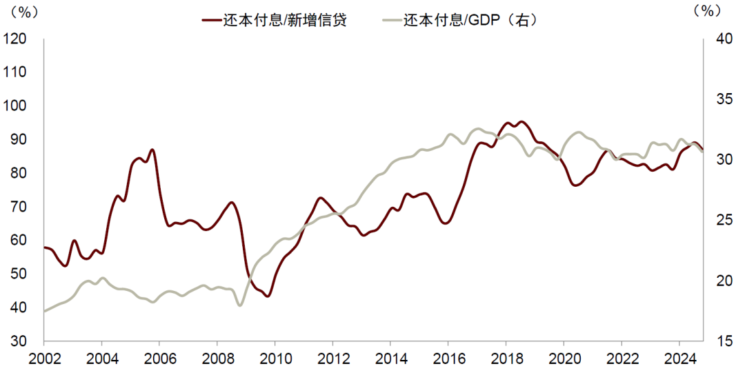 瞻望畴昔,从宏不雅层面若何推衍股市呢?鉴戒国际教化,金融周期下半场的股市高潮与宏不雅战略力度,尤其是财政的宽度联系性较高。因为金融周期诊治带来的一个中枢问题是债务,政府加杠杆,央行扩表故意于改善私东谈主资产欠债表,这个方面中国仍然有较大空间。2021年以来,我国非金融私东谈主部门还本付息占GDP的比例,以及还本付息占新增信贷的比例合座捏平,尚未出现显着下降(图表25)。