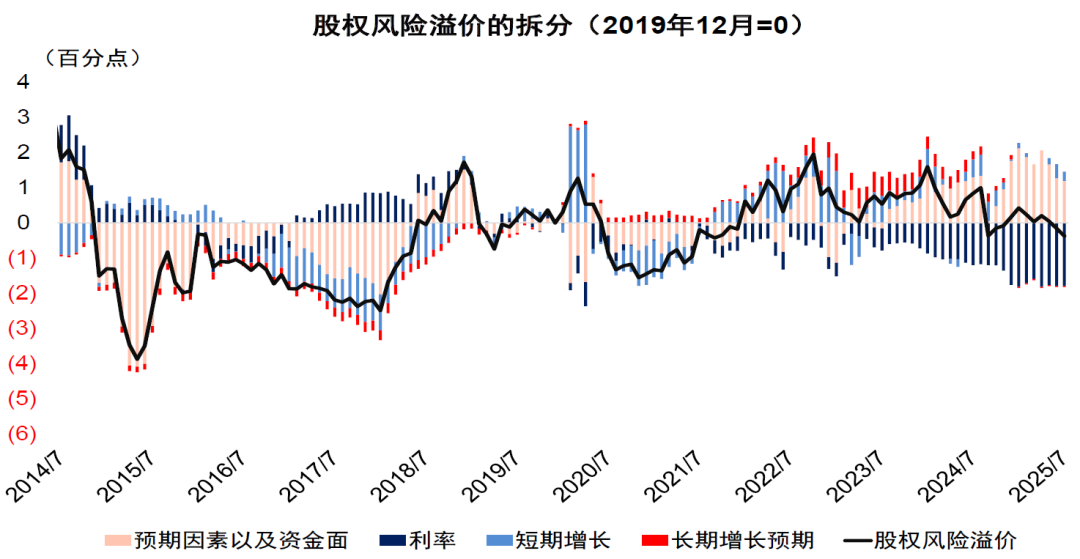 2024年“924”以来, 上证指数从2700点反弹至近期的3600点阁下,与2021年的高点(3724点)收支不大。咱们不妨将A股的股权风险溢价拆分红四个身分,即利率、短期经济增长、恒久经济增长预期、其他预期和资金面身分。咱们的估算泄露,2023年下半年到2024年底一段时辰内,商场对中国中恒久经济出息预期一度相等严慎(图表1中的红色柱状图),给股市增添了较大的下行压力。但2024年四季度这个严慎预期获取了较好的矫正,而本年年头以来,在DeepSeek爆发的布景下,商场对中国经济出息的预期则更为有信心,给股市增添了上行能源。2025年二季度方法GDP同比增速为3.94%,GDP平减指数同比增速为-1.24%。战略利率下降稳重,2024年9月以来,七天逆回购利率从1.7%下降到1.4%,而近期利率未见显着变化。图表1也泄露,短期增长似乎对这轮股市上行未带来能源,而利率在前年四季度对股市带来能源之后,近期并未增添新动能。本轮A股高潮的主如果风险溢价下降鞭策(图表1中浅粉色部分)。