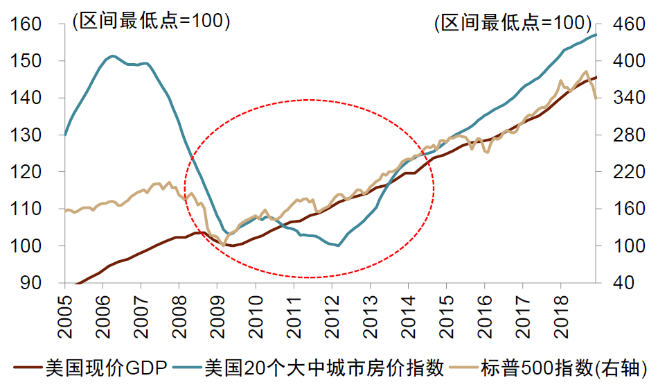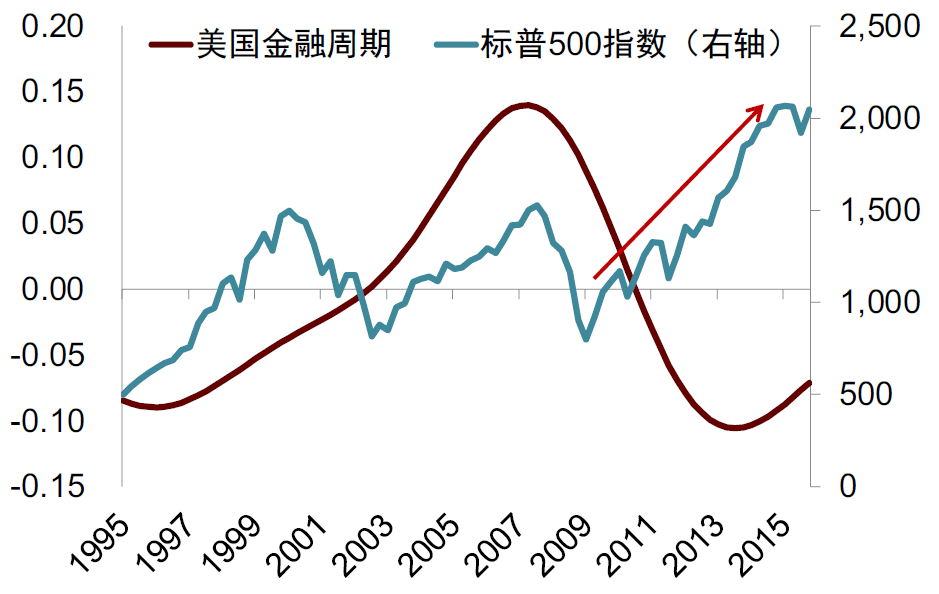 好意思国在次贷危险爆发后,股市快速下行,但一段时辰之后股市先于经济基本面和房价反弹,在2009年后出现一轮捏续较长的高潮。好意思国在2007年爆发次贷危险后,20个大中城市房地产价钱下降到2012年一季度才触底反弹。好意思国的方法GDP到2009年二季度到达阶段性低点。关联词,如果看标普500指数,在2009年一季度也曾驱动触底反弹,率先实体一个季度,率先房价三年(图表4)。从金融周期来看,好意思国从2007年到2013年都处于金融周期下行阶段,关联词标普500指数从2009年低点到2013年齐全了翻倍(图表5)。