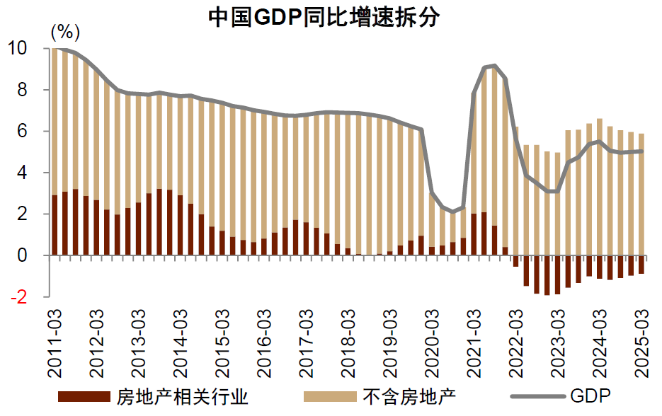 注:房地产联系行业占本质GDP比重的分子是当季房地产业本质GDP和房地产开辟投资本质值的和,分母是当季本质GDP;房地产业本质GDP由统计局公布,房地产开辟投资的本质值由房地产开辟方法投资与PPI推算而成;剩余部分为不含房地产的GDP