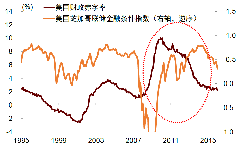 货币战略方面,次贷危险爆发后,好意思联储马上将联邦基金利率降至零,并开启量化宽松。联邦基金利率从2007年8月的5%马上下降至2008年12月的零利率。除了裁减联邦基金利率,好意思联储从2008年驱动量化宽松,向商场注入流动性。通过量化宽松,好意思联储收购恒久国库券,从而推高恒久国库券的价钱,裁减其收益率。好意思国的金融条目指数从2008年底驱动下降,到2009年底参预宽松区间(图表7)。