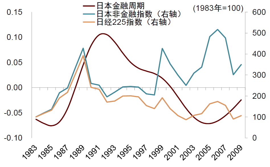 图表10:日本金融周期下行阶段,经济和股市发达弱