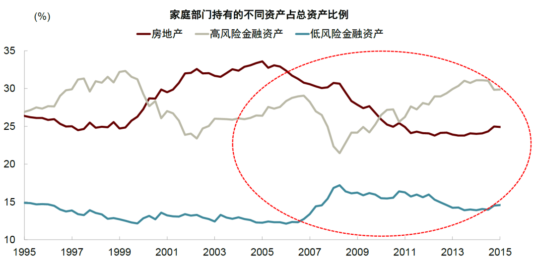 金融周期下行的最初几年日本政府部门的宏不雅杠杆率不升反降,90年代末才驱动上升,与此相应,日本族庭部门宏不雅杠杆率在金融周期见顶后罢手上行,但莫得出现下降。而同期非金融企业宏不雅杠杆率先是络续上升,90年代末跟着政府加杠杆后才驱动下降(图表12)。这种情况下,日本私东谈主部门并莫得像好意思国那样快速增配风险资产,推升股市。1994 年到 2005年期间,日本住户部门的资产树立中,房地产占比从 41.3% 下降到27.0%,高风险的金融资产占比从 5.7% 上升到9.1%,低风险的金融资产占比从 38.5% 上升到48.9%(图表13)。