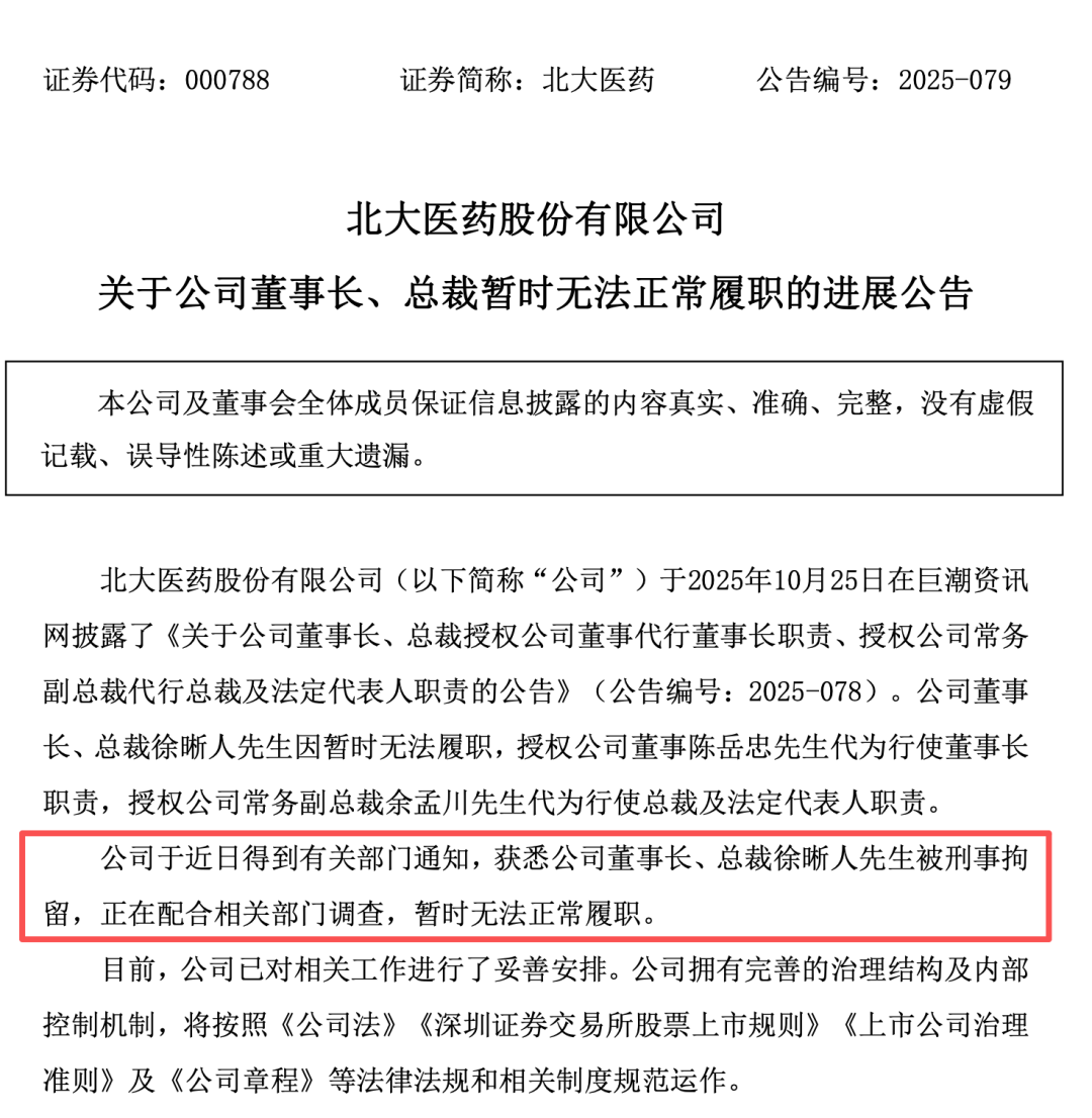北大医药(000788)10月29日公告,公司于近日获得相干部门奉告,获悉公司董事长、总裁徐晰东说念主被刑事拘留,正在配合相干部门看望,暂时无法普通履职。松抄本公告暴露日,公司法则权未发生变化,公司董事会运作普通,公司财务及出产策画搞定情况普通。